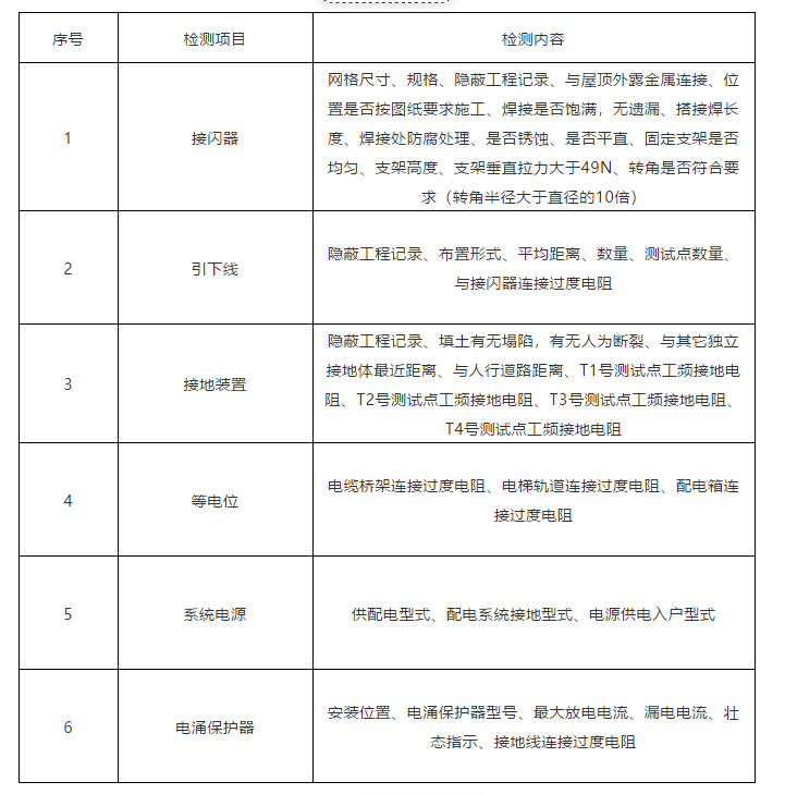 雷电放电电压高、时间短,整个过程伴随多种物理效应,如:静电感应、高温高热、电磁辐射、光辐射等,这些物理效应的共同作用已严重危害室内弱电设备的安全运行,甚至危及工作人员的安全。因此,确定一个建筑物防雷装置是否合格应进行防雷检测工作。