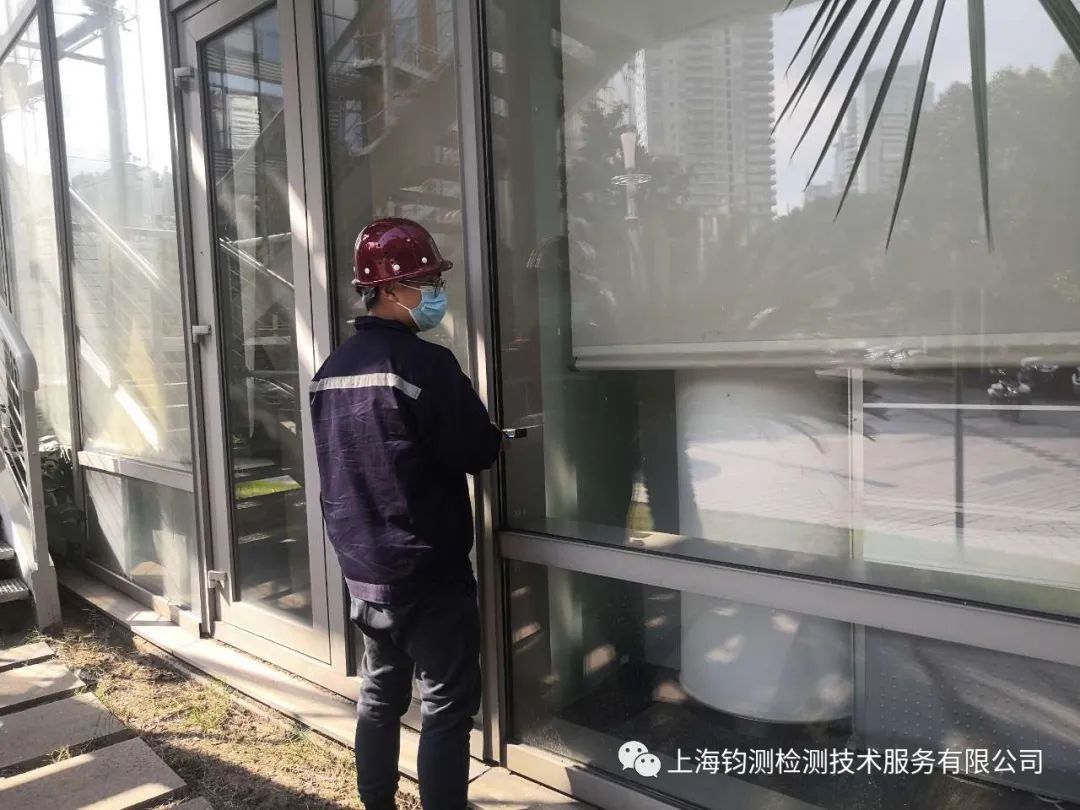 我们先从外部玻璃幕墙进行检测,两位工程师分头行动,对玻璃幕墙面板,受力构件,密封胶,结构胶,连接件的损坏部位,范围和程度进行仔细检查和记录,内部的检测对玻璃的3c标志,中间的小气泡,钢柱间的焊缝连接,房屋楼顶的渗水情况都做了详细的了解,每一个检测部位都使用了不同的仪器。