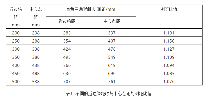 设换能器在构件直角边上对称布置,换能器的直径为38mm,取近边缘距200mm~500mm时,其与中心点距的测距比值见表1。由表1可知,当近边缘距为200mm时,测距的比值最大,即检测误差大;随近边缘距的增大,其测距的比值逐渐降低;400mm以上时,两者的比值在10%以内。