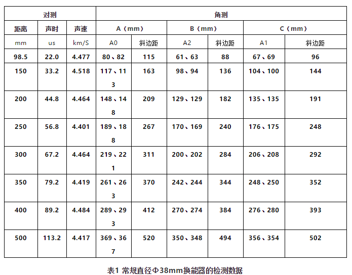 按照“同声时等效测距法”,采用常规换能器直径Ф38mm(频率f=50kHz、零读数t0=12.4 us)在匀质梯形试件不同阶梯测距的检测数据见表1。表1角测中的A、B、C栏分别表示构件边缘至换能器的中心距A0、近边缘距A2、按“同声时等效测距法”修正距A1及其按这2条直角边距计算的斜边距。(超声平测法的直线回归方程L=-12.2+4.379t;z简化取6mm)